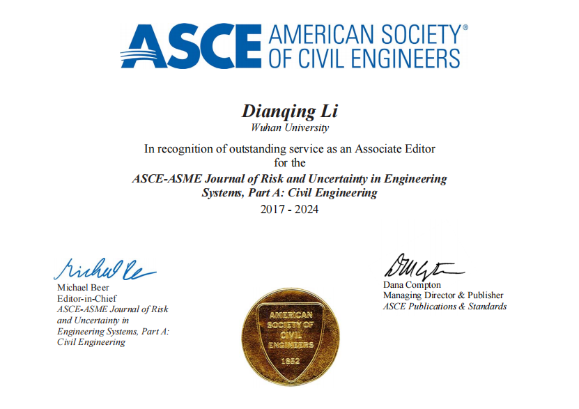 李典庆教授担任国际期刊副主编工作获美国土木工程师学会表彰