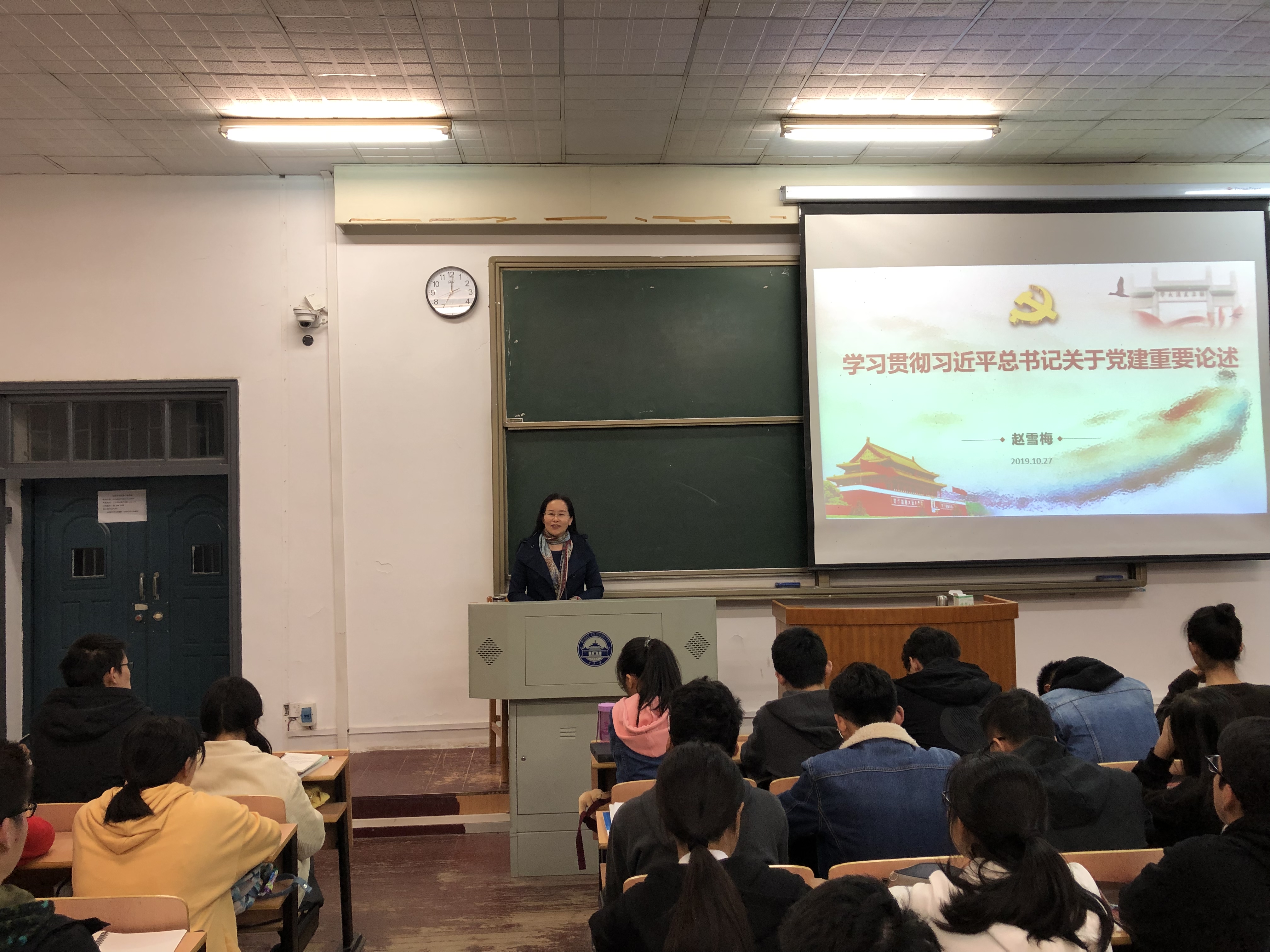 2019年10月27日晚7时,色播app 第九分党校第64期入党积极分子培训班第三讲在工学部五教113教室举行,色播app 党委副书记赵雪梅教授为同学们讲授了“习近平总书记关于党建的重要论述”。 >>