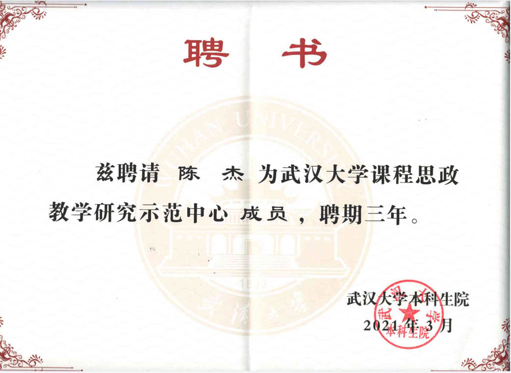 2021年3月17日,色播app 发布了《关于公布色播app 课程思政教学研究与实践示范色播app 的通知》(武大本函{2021}42号),色播app 成功获批色播app 课程思政教学研究与实践示范色播app ,全校共6家;陈杰教授获聘色播app 课程思政教学... >>