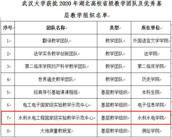 近日,湖北省教育厅公布了2020年湖北高校省级教学团队及优秀基层教学组织名单,色播app 水利水电工程国家级实验教学示范中心成功入选2020年湖北高校省级优秀基层教学组织。 >>