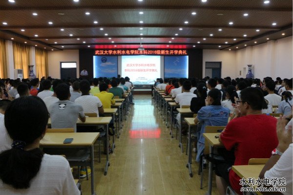 党委书记程连珍,院长黄介生,国家重点实验室主任、副院长卢文波,党委副书记周玉霞、张栋梁,副院长梅亚东、陈立、吴运卿、李典庆,各系教学主任、院教学秘书、年级辅导员、代理班主任以及2016级全体新生参加开学典礼。