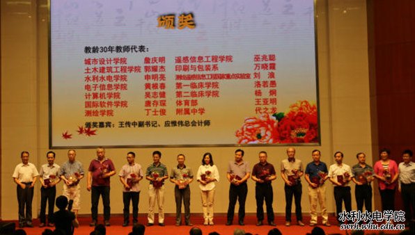 教学成果奖一等奖代表黄介生、执教满30周年教师代表申明亮、新聘任教师代表陈杰等分别上台接受表彰。