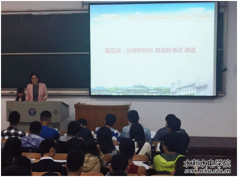 王新山教授为本期入党积极分子培训班作了第一场授课——中国共产党的性质和宗旨。王教授从“正确理解中国共产党要同时成为‘两个先锋队’”、“党的领导核心地位是历史的必然”、“党的核心领导是中国特色社会主义事业胜利的根本保证”、“建设中国特色社会主义必须坚持‘三个代表’重要思想,加强和改善党的领导”四个方面展开生动的讲述,结合学校和社会发展,条分缕析,娓娓道来,论证了中国共产党的领导地位和先进性是由其性质和宗旨决定的,使同学们从中受益匪浅。