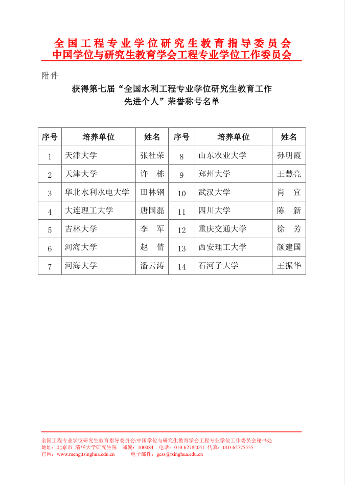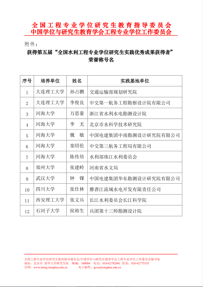 文件公布了18名 “全国水利工程专业学位研究生优秀指导教师”、14名“全国水利工程专业学位研究生教育先进个人”和12名“全国水利工程专业学位研究生实践优秀成果获得者”,其中色播app