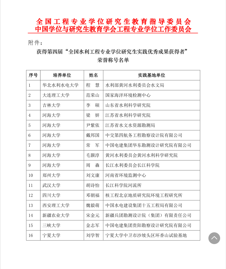 文件公布了16名 “全国水利工程专业学位研究生优秀指导教师”、20名“全国水利工程专业学位研究生教育先进个人”和16名“全国水利工程专业学位研究生实践优秀成果获得者”,其中色播app