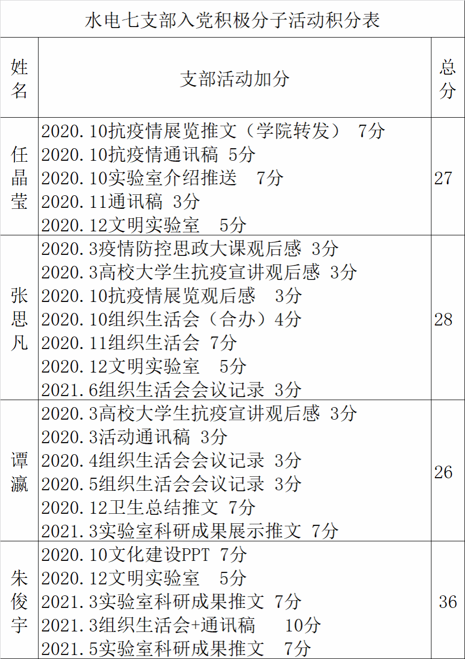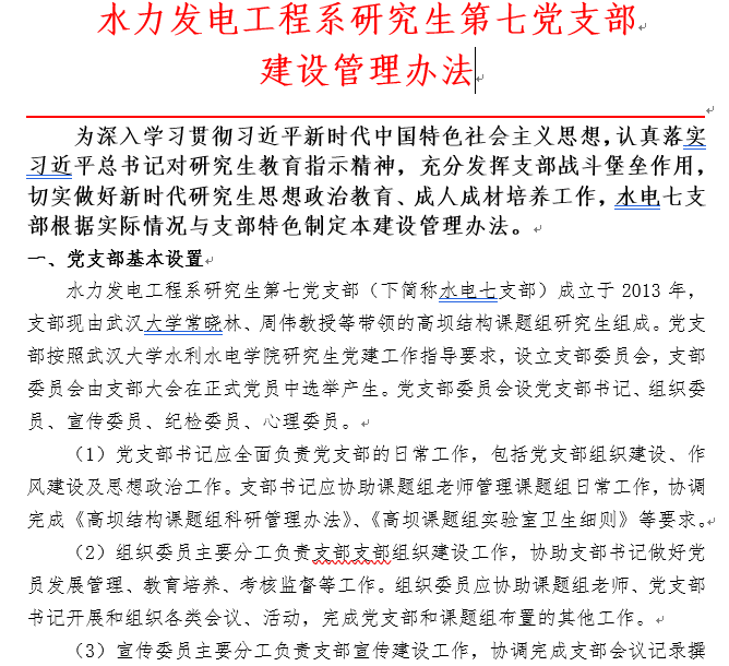 水电七支部不断创新理念和机制,着力推进党支部工作科学化,在标准化基础上提升工作实效性,确保党建工作质量。实行党员发展、教育、管理、监督、服务等全链条全流程管理:党员发展实行积分考察制、预审制,帮助入党积极分子精确把握入党进度,增强入党的主动性。预备党员实行公开承诺制,明确预备党员转正期的目标及转正时应兑现的事项;转正时实行党章理论学习考核制,促使预备党员更加重视日常理论学习;党员年度总结实行评议制,公开评议直面问题,让“红脸出汗”成为常态,也成为党内评先评优的依据。同时,支部牵头组织实施考勤签到打卡制、安全卫生责任制、年终量化考核办法、学术科研奖励机制、帮扶联系制等,明确对支部及其成员的管理和服务事项,既发挥了党员先锋作用,也提升了支部活力和组织力。