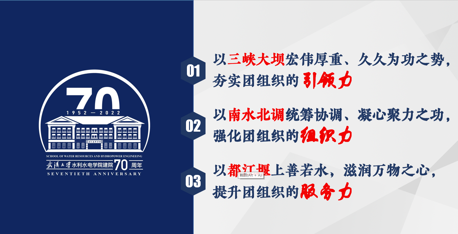 团委将三项著名大型水利工程的精神特质与团组织的三力协同的内涵巧妙融合。通过“以三峡大坝宏伟厚重、久久为功之势,夯实团组织的引领力”、“以南水北调统筹协调、凝心聚力之功,强化团组织的组织力”、“以都江堰上善若水、滋润万物之心,提升团组织的服务力”三个板块,围绕思想引领、基层团建、团学改革、学风建设、品牌活动等方面展示了色播app