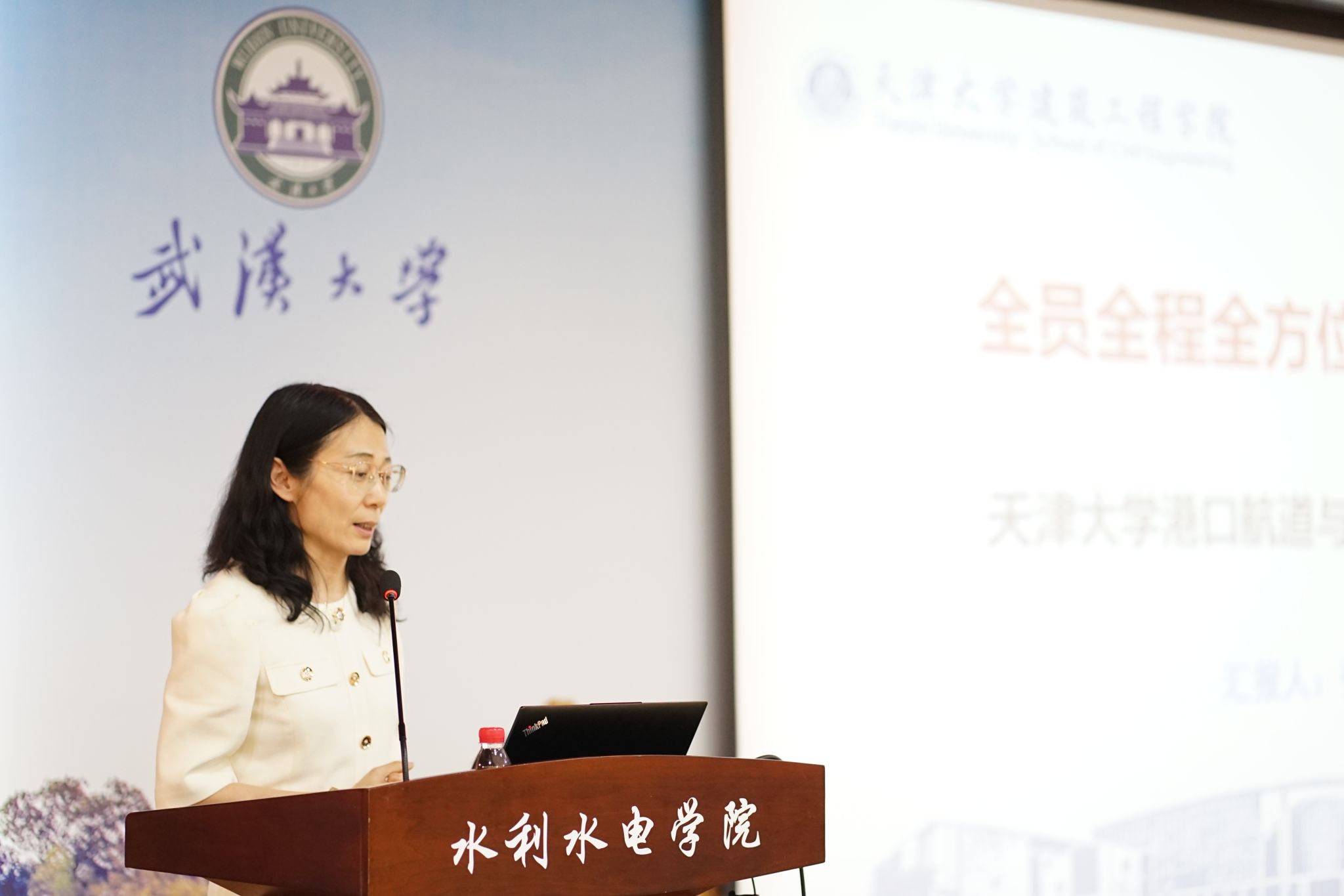 港航专业的历史沿革、教学改革以及实习实践情况,重点介绍了港航专业本科的认识实习、毕业实习以及国际交流的开展情况及目前港航专业的师资组成与人才引育成效;陶爱峰介绍了河海大学虚拟课程的建设情况,重视教学的守正创新和与时俱进,不断创新教研形态,加强教学研究,共建优质资源;张金凤以“全员全程全方位育人”为主题,介绍了天津大学在当前“三全育人”“五育并举”新形势下大类专业课程体系的构建,列举了天津大学在招生宣讲、专业讲座、实验室学习、师友导师计划、新工科毕设等方面的具体改进措施。与会专家围绕专业建设、人才培养、工程教育专业认证、课程建设、教材建设等主题进行了深入讨论,积极为港航专业高等教育未来发展建言献策。最后,港航专业建设指导组组长郑金海作总结讲话,他以三个“成功”总结了本次会议和讲课竞赛,他认为,本次讲课竞赛很成功,交流会很成功,武大水院的组织、策划、服务很成功,港航专业的建设离不开各个学校、老师们的努力,希望大家能够进一步分享自身的课程资源与建设经验,加强专业共建共享,发挥不同学校的自身特点与优势,落实好交流中提出的建设性意见,更好地实现港航专业的建设发展。