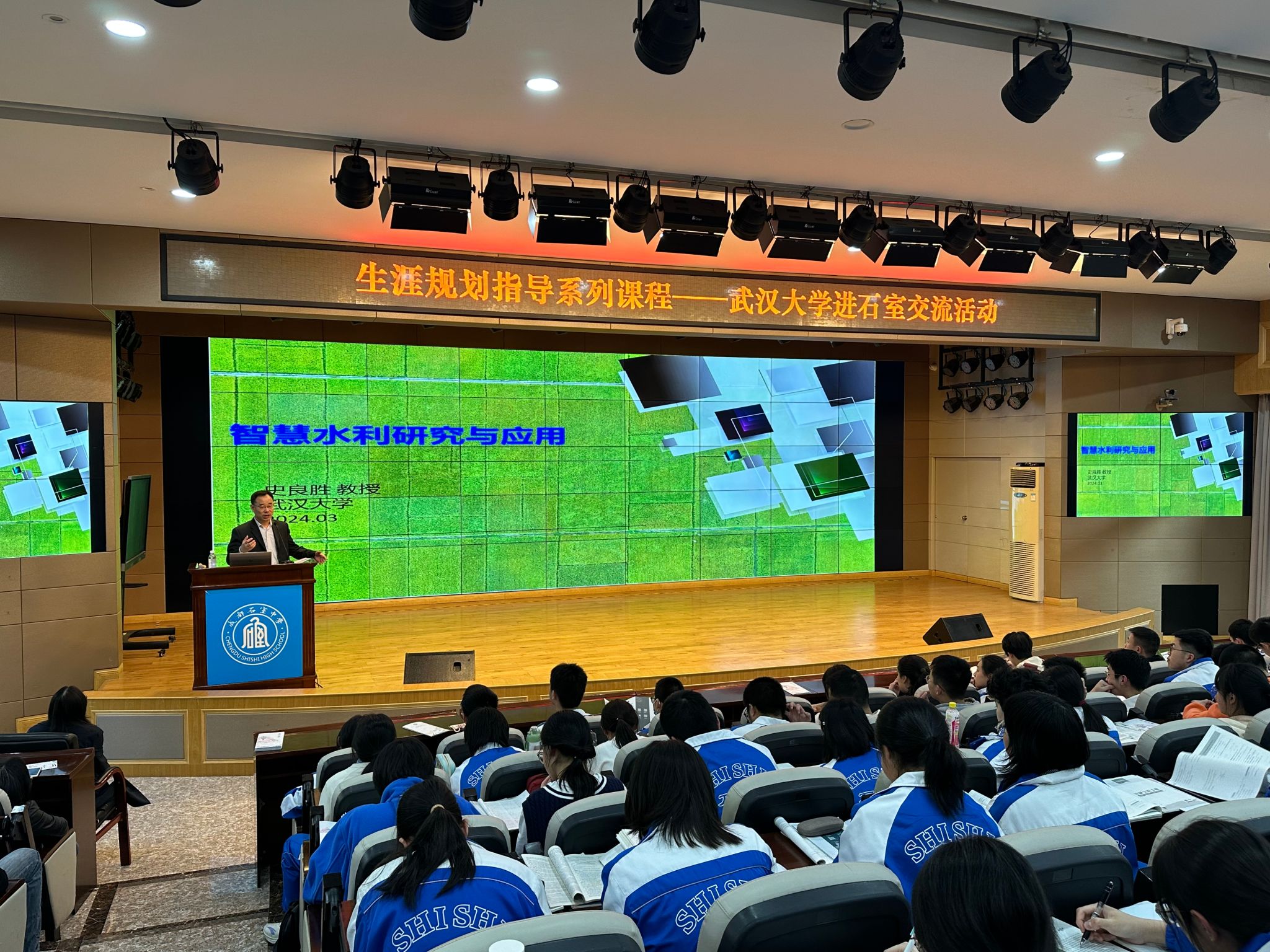 随后,史良胜以《智慧水利研究与应用》为主题,为石室中学的学生们带来了一场引人入胜的讲座。他回溯了人工智能的初始起源,讲述了AlphaGo如何成功问世及现今极为热门的ChatGPT、Sora,借此引入人工智能在水利行业的实际运用,并与在场学生互动答疑,场面热烈。
