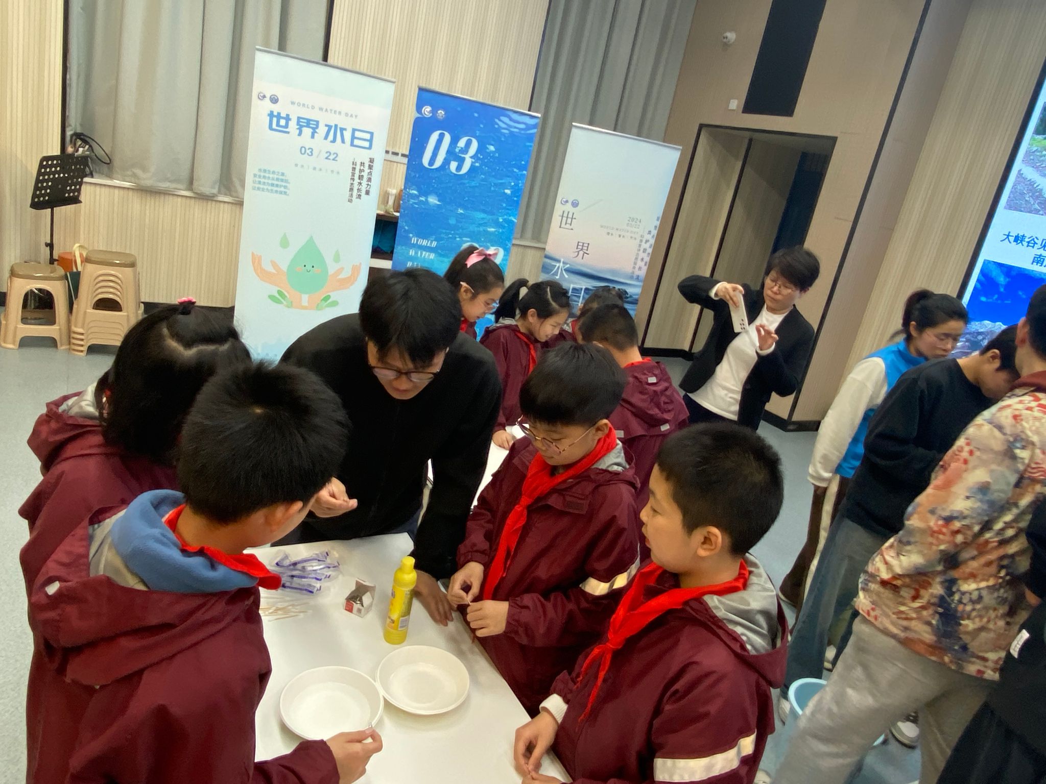 第二附属小学,李志威副教授以“雅鲁藏布江大峡谷历险记”为主题,结合自身经历,向同学们介绍青藏高原的形成与演化、雅鲁藏布江流域的水系情况以及雅鲁藏布江大峡谷的水资源等地理知识。他生动描述自己在科考过程中遇到的悬崖绝壁、激流等惊险场景,引发同学们热烈讨论。志愿者带领四年级同学们体验一系列与水相关的小实验,科普水的基本特性,号召同学们珍惜水资源。学生会权益部的同学们在工学部七舍门前举办“如果停水三天”的主题摆点宣传活动,以崭新的形式吸引同学们用纸笔写下对停水生活的想象,让更多人了解水是人类赖以生存的重要资源,理解水资源对日常生活的重要意义,阐明水资源的重要性。