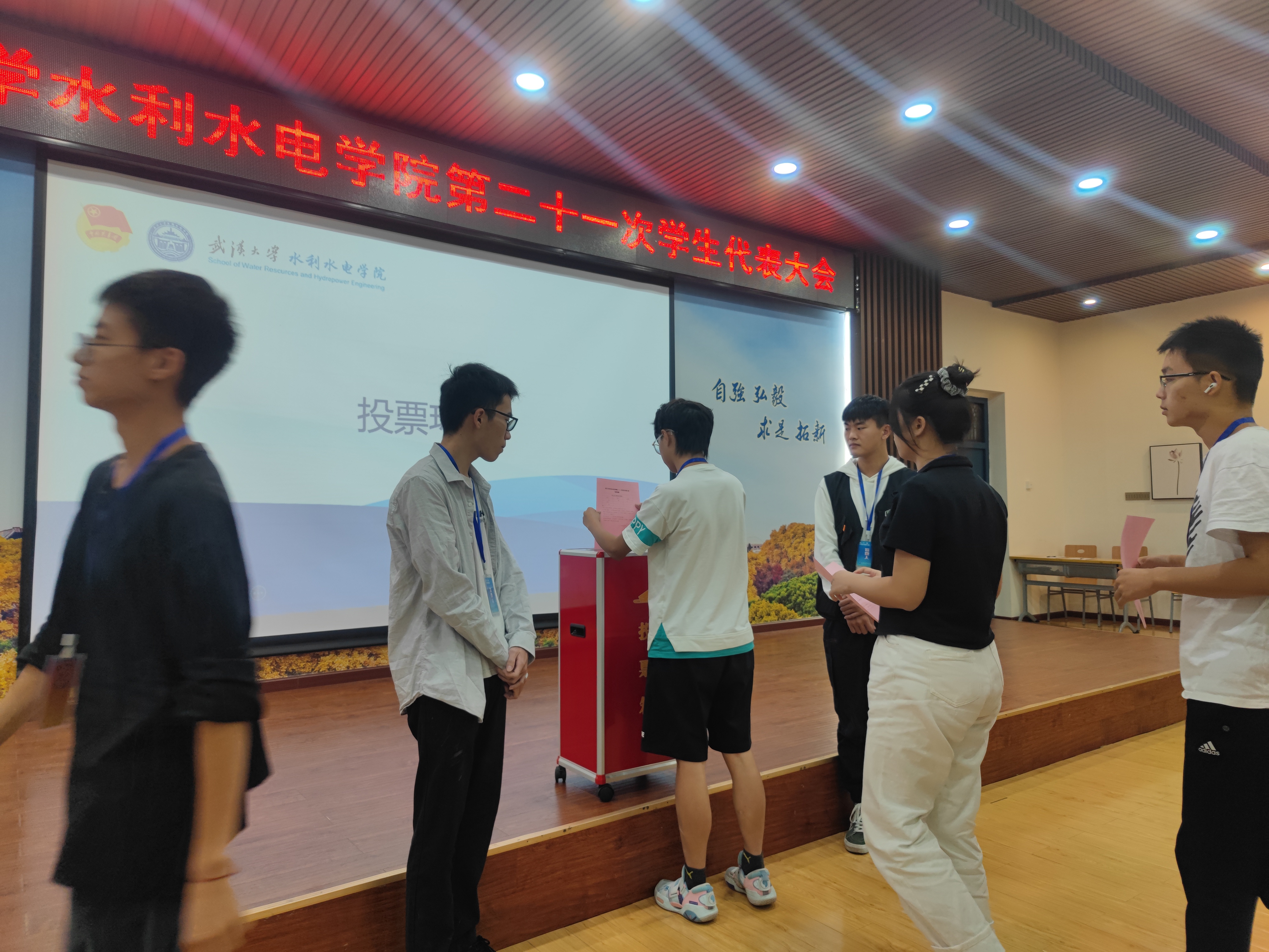 大会第二部分审议并通过了关于代表及候选人的资格审查报告和大会选举办法。随后,大会选举正式开始,四位主席团候选人钟昕贝、柴淑云、吕雯珺、刘嘉宇先后进行了自我展示和答辩。经全体代表投票,最终刘嘉宇、钟昕贝、吕雯珺三位同学成功当选为新一届学生会主席成员。