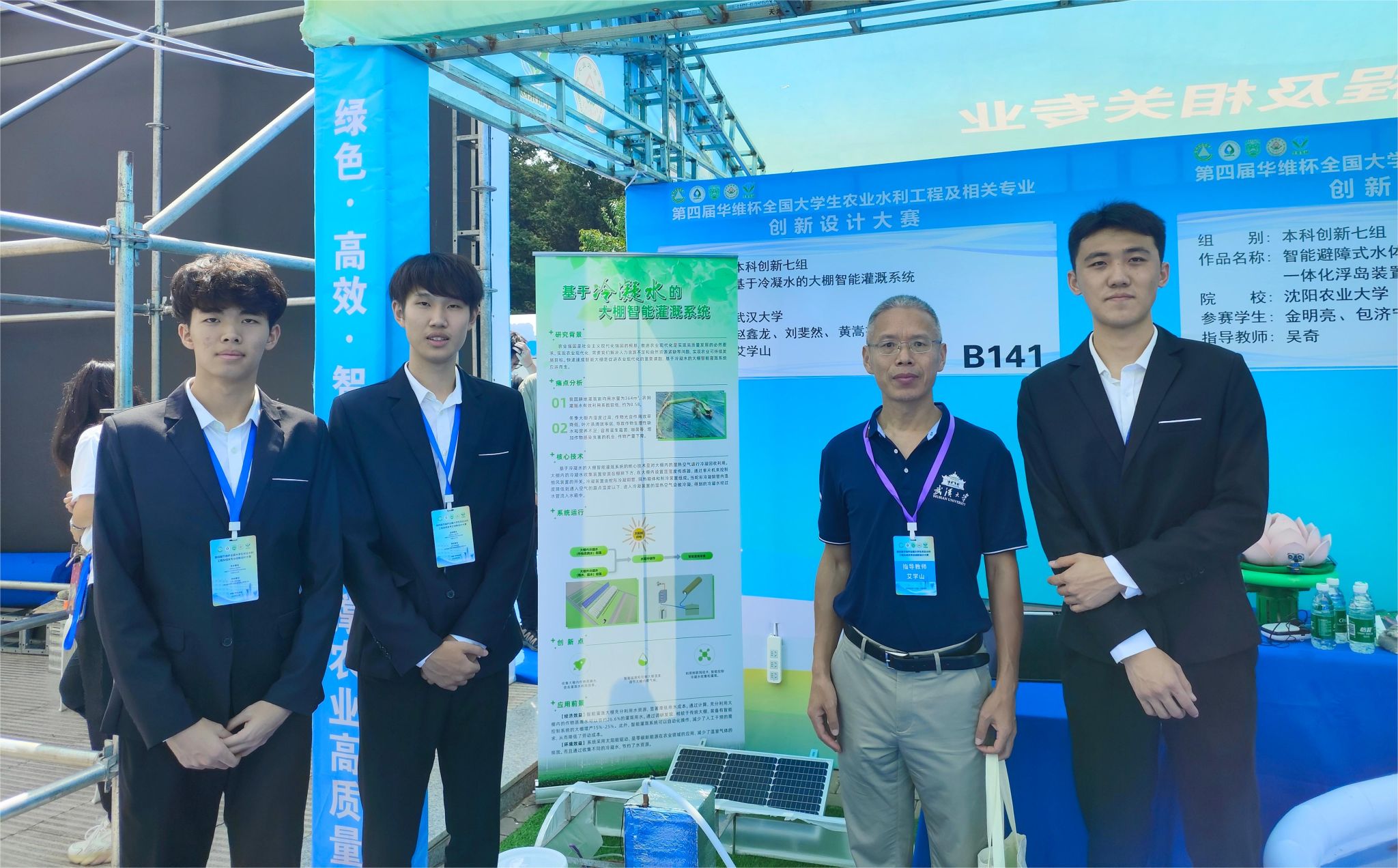赵鑫龙、刘斐然、黄嵩杰、沈玎睿共同参与。队伍作品《基于冷凝水的大棚智能灌溉系统》针对大棚内湿度过高导致作物减产、作物蒸腾水未得到充分利用等问题,利用自动冷凝装置与智能灌溉装置,融合物联网技术,实现大棚内作物蒸腾水回收利用。