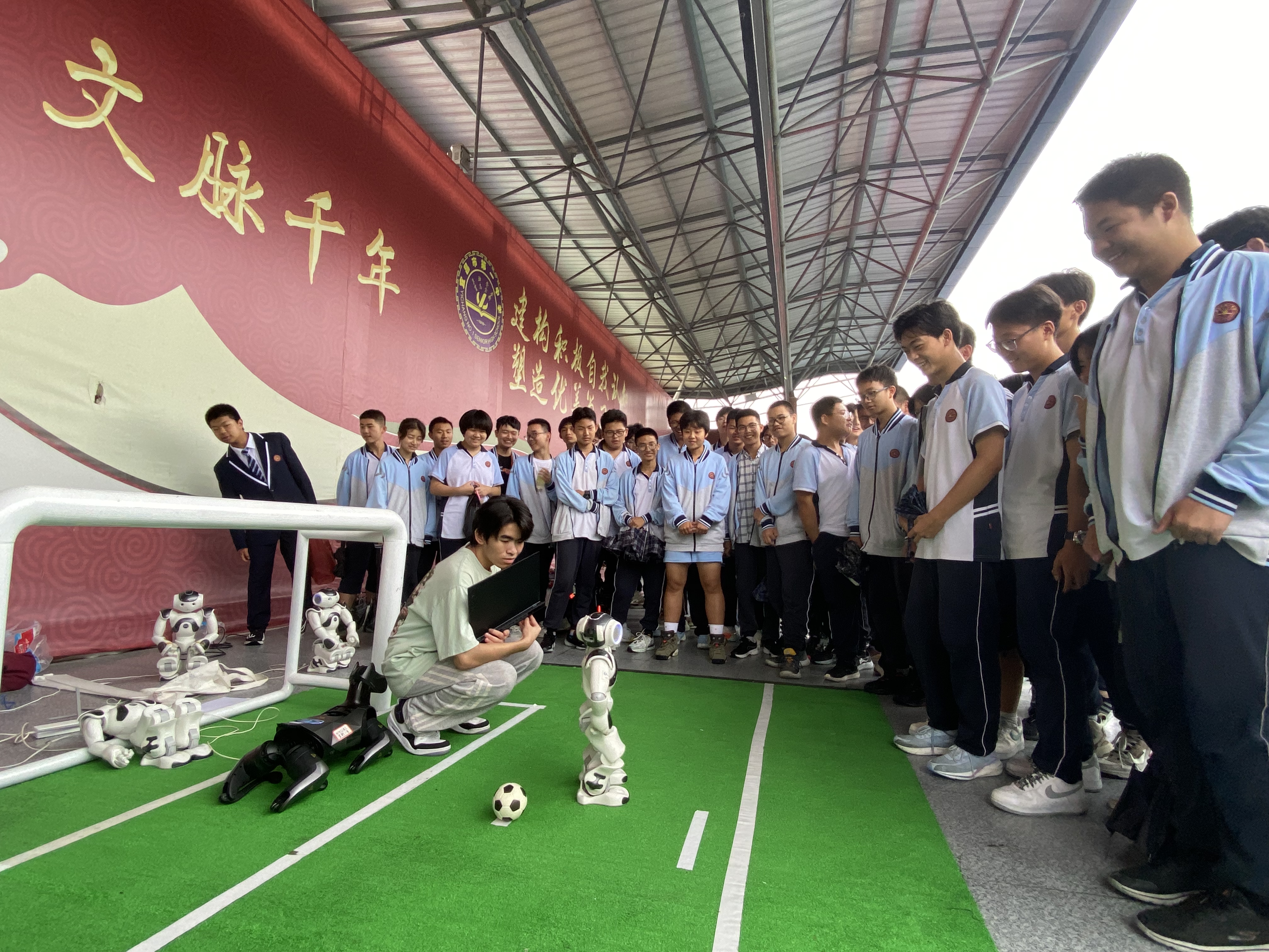 NAO机器人团队展示了一场别开生面的机器人舞蹈和机器人足球赛,科技与艺术相结合,吸引多名中学生驻足观看,并饶有兴趣地与机器人踢球互动,在亲身感受中激发数理兴趣,激励科研志向。