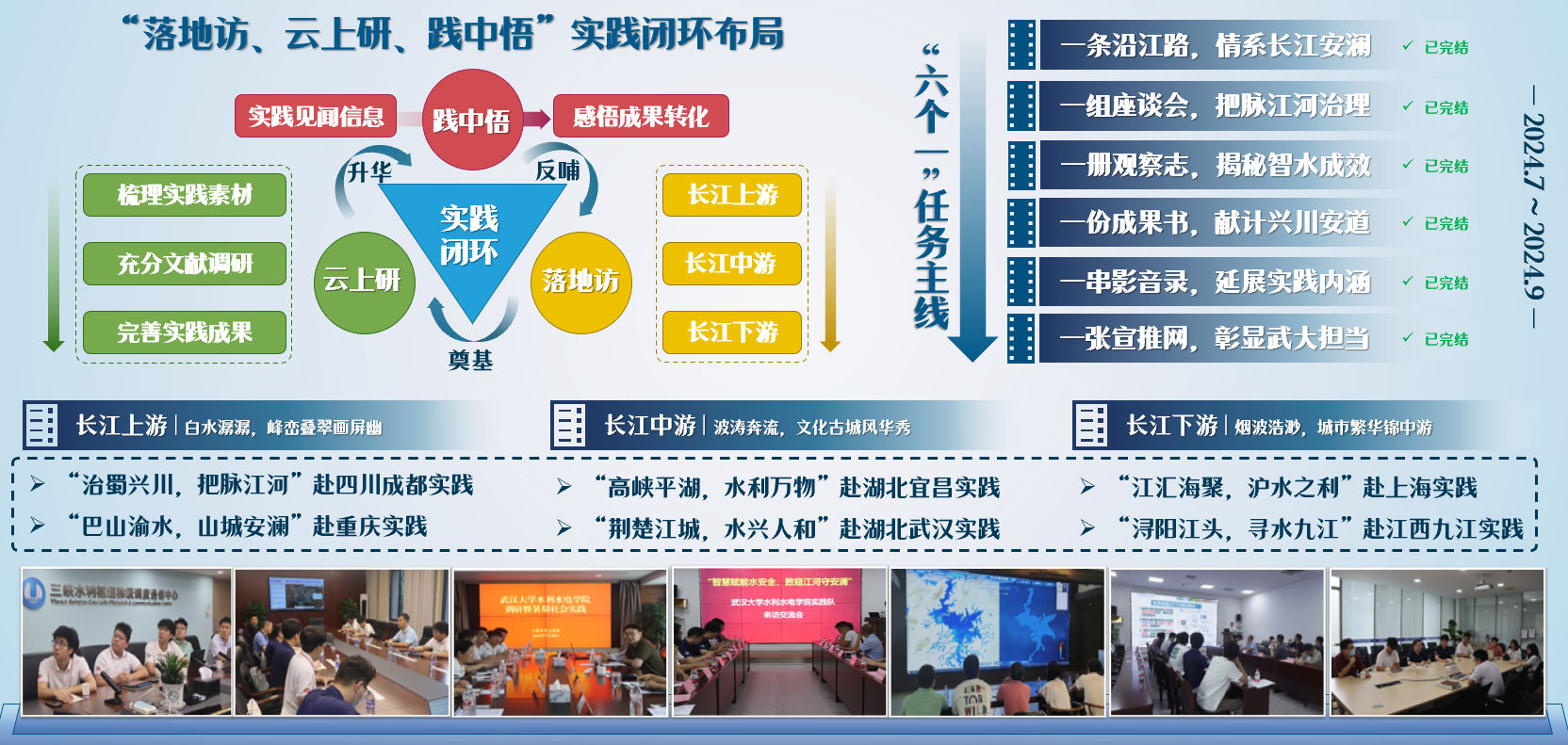 该实践队聚焦长江流域防灾减灾现代化这一国家重大战略需求,以长江流域水安全保障为行动线,锚定实践目标,共谋实践规划,探索构建了“落地访、云上研、践中悟”的实践闭环布局,并围绕“六个一”任务主线落地各项实践工作。实践队依托夏军院士团队“长江模拟器”最新成果,深入调研长江沿线六市十余个政府单位、流域机构、水利枢纽、科研院所,探索防洪减灾体系和能力现代化的路径。