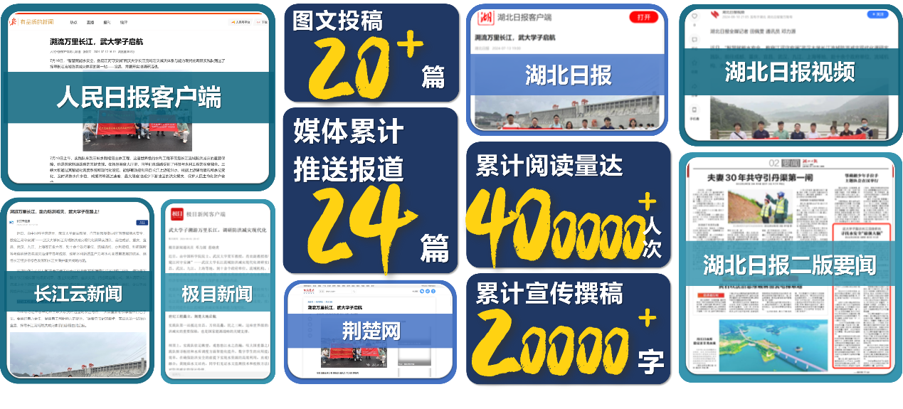 实践队成员们用脚步丈量祖国大地,记录详实丰富,积累视频素材百余条,纪实记录十余份,案例总结、调研报告、论文分析、咨政建议等,一笔一划都在书写着他们守护长江安澜的美好愿景。实践事迹获人民日报、湖北日报等媒体报道24篇,累计浏览量超40万人次,珞珈强音,走街串巷,越传越广,产生了广泛的社会影响力。