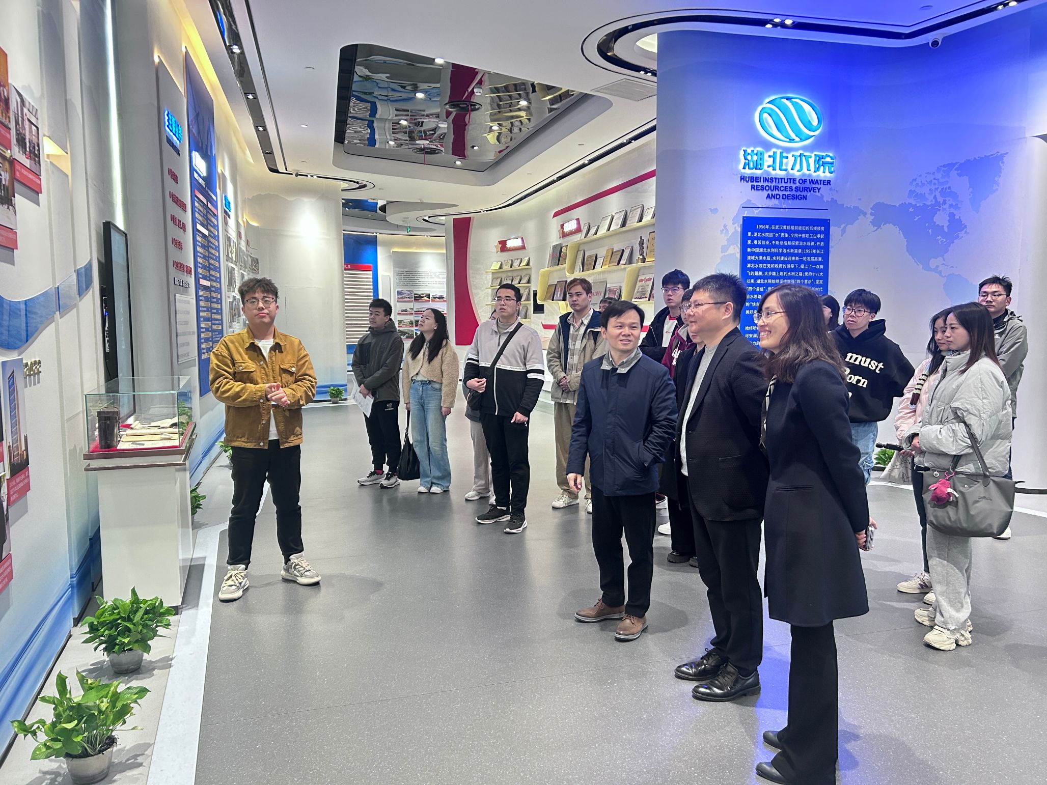 紧接着,李杰带领武大水院师生一行参观了公司展厅。在参观公司展馆的过程中,李杰详细介绍了湖北水院多年的改革发展历程和未来企业发展方向。他表示湖北水院是湖北省属唯一甲级水利水电规划勘测设计单位,是湖北水利主要技术支撑单位,设计建成数百项重大工程,技术力量雄厚,综合实力跻身全国水利勘测设计行业第一方阵。