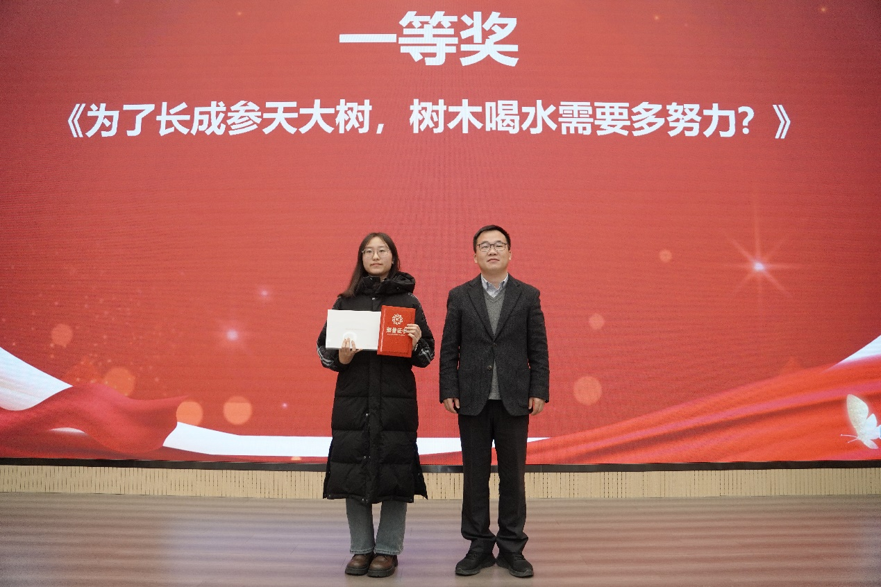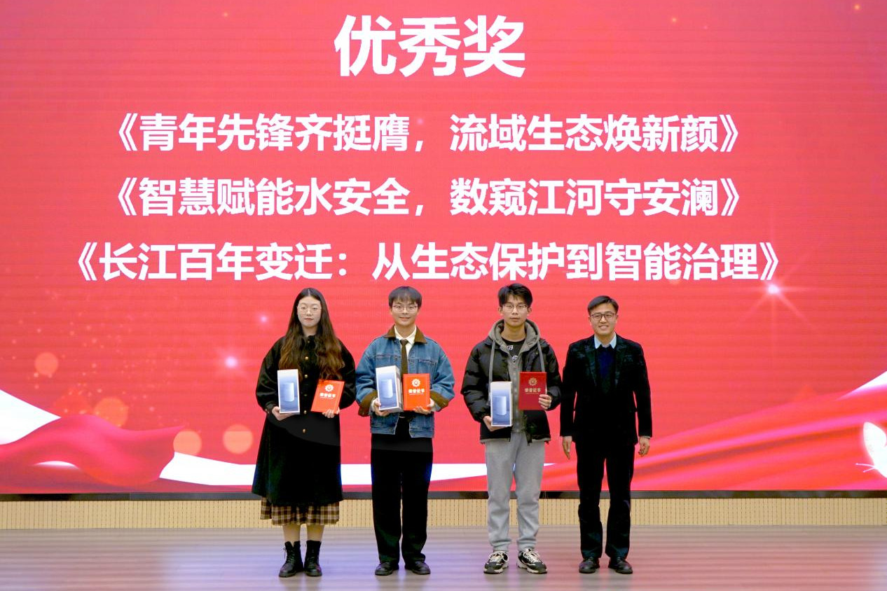 颁奖环节,获奖代表依次上台领奖,并在现场展播了他们的优秀作品,赢得了观众的阵阵掌声。其中,一等奖作品《为了长成参天大树,树木喝水需要多努力?》以树木的喝水和蒸腾为主题,不仅揭示了树木与水的紧密关系,还传递了生态保护和水资源可持续利用的重要性,以其独特的视角和精湛的制作获得了全场瞩目。二等奖作品《树木的年轮语言:水资源管理的新视角》以树木年轮为切入点,通过生动的案例和详实的数据,向公众普及了树木年轮在水资源管理中的应用;《智驭水流·黄河水网的探秘》以黄河水网为主题,通过历史的回望和科技的展现,描绘了水利事业的辉煌成就和智慧水利的崭新篇章。三等奖作品《问水、寻水、知水》《潜龙润湾区》《三峡:生态与安全》及优秀奖作品《青年先锋齐挺膺,流域生态焕新颜》《智慧赋能水安全,数窥江河守安澜》《长江百年变迁:从生态保护到智能治理》等也各具特色,充分展示了武大师生在水科普微视频创作方面的创新能力。