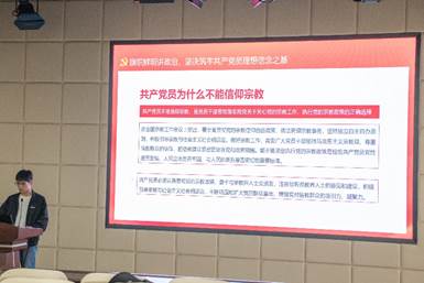 支部委员边宏光同志以“旗帜鲜明讲政治,坚决筑牢共产党员理想信念之基”为题论述了共产党员为什么不能信仰宗教。