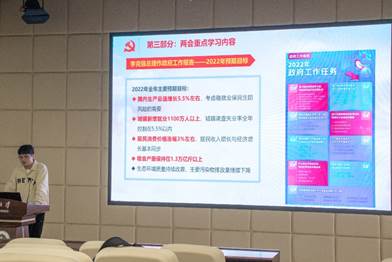 随后,陈齐民同志详细介绍了两会重点学习内容,主要包括国务院总理李克强所作政府工作报告和政协主席汪洋所作政协常委会工作报告。国务院总理李克强在政府工作报告中提出了深刻认识“两个确立”的决定性意义,要增强“四个意识”、坚定“四个自信”、做到“两个维护”。政府工作报告中对2021年工作进行了回顾,2021年完成的目标任务包括:(1)国内生产总值达到114万亿(2)居民人均可支配收入实际增长8.1%(3)关键核心技术攻关取得重要进展(4)地级及以上城市细颗粒物平均浓度下降9.1%(5)疫苗全程接种覆盖率超过85%。同时,政府报告对2022年的目标也做了明确规划,包括:(1)国内生产总值增长5.5%左右(2)城镇新增就业1100万人以上(3)居民消费价格涨幅3%左右(4)粮食产量保持在1.3万亿斤以上(5)生态环境质量持续改善,主要污染物排放量继续下降。