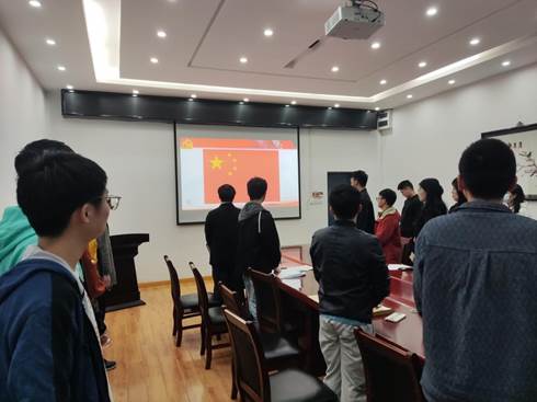 会议在激昂的国歌中开始,成博超同志清点到会人数并强调会场纪律,宣布此次会议满足开会条件。