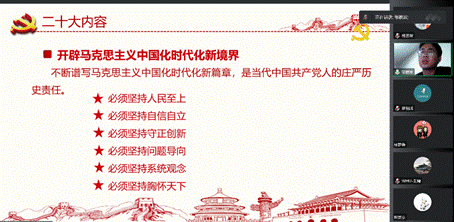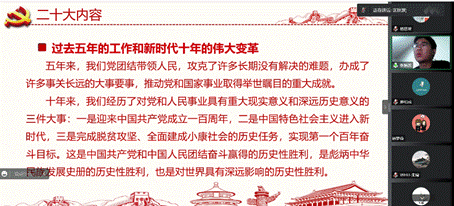 支部书记张映波同志带领大家重点对二十大报告的原文开展学习,二十大报告主题鲜明,总结了过去五年的工作和新时代十年的伟大变革,十年来,党和国家事业取得历史性成就、发生历史性变革,推动我国迈上全面建设社会主义现代化国家新征程。随后,介绍了新时代新征程中国共产党的使命任务以及中国式现代化的相关内容,并阐述了对于中国式现代化的理解与认识,并从经济发展、科教、人民民主、依法治国、文化、民生、人与自然和谐共生、国家安全体系和能力、国防和军队、外交等多个方面介绍了二十大报告原文。最后介绍了著名专家学者对二十大报告的解读,促进支部成员对二十大报告有更深的理解,便于大家对二十大报告的进一步学习。此外还分享给大家关于二十大的学习资料,便于支部成员会后拓展深入学习。